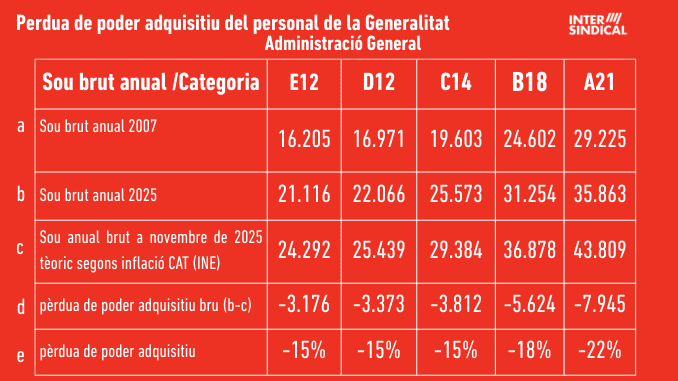 Fa poc més de dos anys, La Intersindical va denunciar i quantificar en un informe la pèrdua de poder adquisitiu dels salaris bruts dels treballadors i treballadores de l’Administració de la Generalitat. Prenent com a punt de partida les dades d’aquell informe, si prenem com a base els salaris bruts de 2007 i els incrementem en funció de l’IPC fins a novembre de 2025, el resultat de l’exercici és el següent: