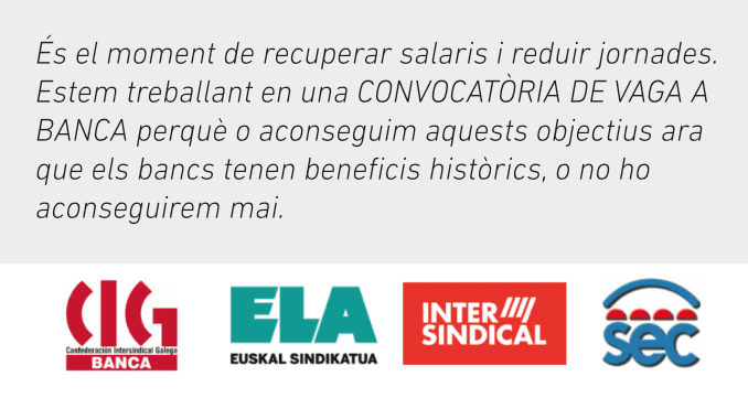 És el moment de recuperar salaris i reduir jornades. Estem treballant en una CONVOCATORIA DE VAGA A BANCA perqué o aconseguim aquests objectius ara que els bancs tenen beneficis històrics, o no ho aconseguirem mai.