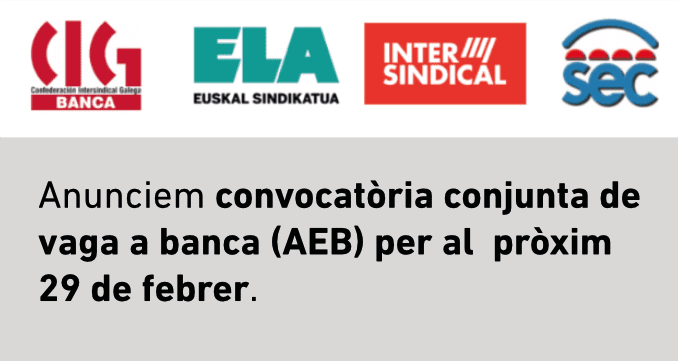 Els sindicats CIG, ELA, SEC (BBVA) i LA INTERSINDICAL aprovem la convocatòria conjunta de vaga per al pròxim 29 de febrer. Esperem poder continuar sumant a altres sindicats de cara a la convocatòria. Per a avançar en la consecució de millores en el conveni és necessària la mobilització de tots i totes des d’ara mateix, no podem esperar a tocar de setmana santa per a fer aquest pas, la deterioració de les condicions laborals i el clima laboral tòxic així ho exigeixen.