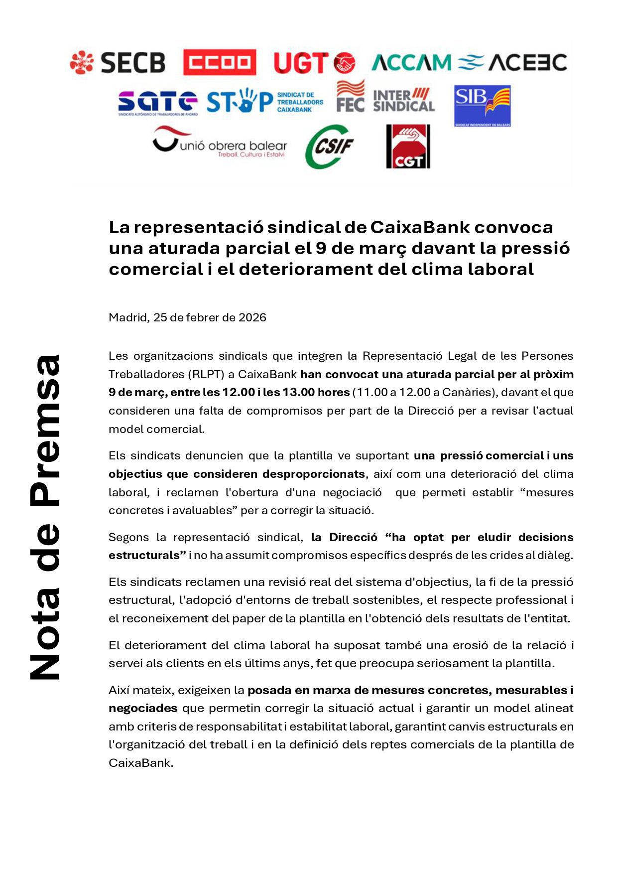 La representació sindicaldeCaixaBank convoquem una aturada parcial el 9 de març davant la pressió comercial i el deteriorament del clima laboral