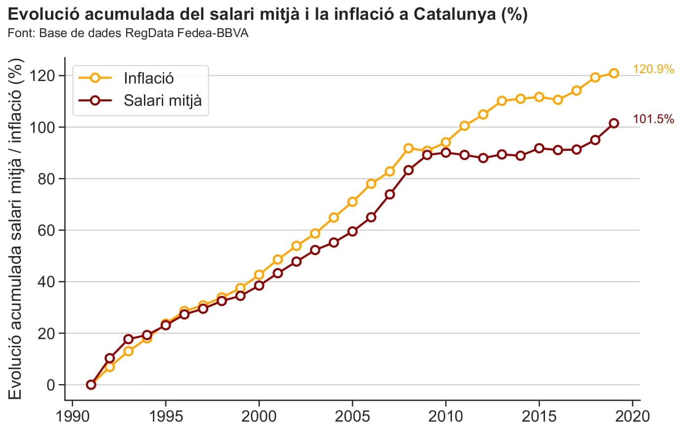 Evolució dels salaris en relació a l’IPC a Catalunya (inferior des de mitjans dels 90)