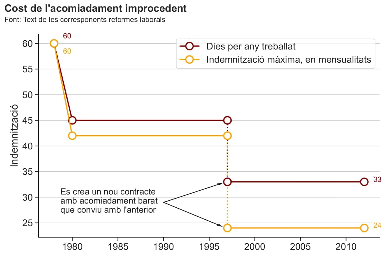 A finals dels anys 70, esser acomiadat de la feina de forma improcedent donava dret a una indemnització de 60 dies per any treballat que podia equivaldre, com a molt, a l’equivalent a 60 mensualitats (cinc anys de sou). Avui dia, després de diverses reduccions, la percepció ja només és de 33 dies per any treballat, amb un màxim de 24 mensualitats (dos anys de sou), i això que també és cada cop més ampli el ventall d’opcions per a les empreses per acomiadar de forma procedent, més barata. La reforma laboral d’aquesta legislatura, de fet, no ha tocat la rebaixa del cost de l’acomiadament aprovada per Rajoy, sinó que l’ha consolidat.