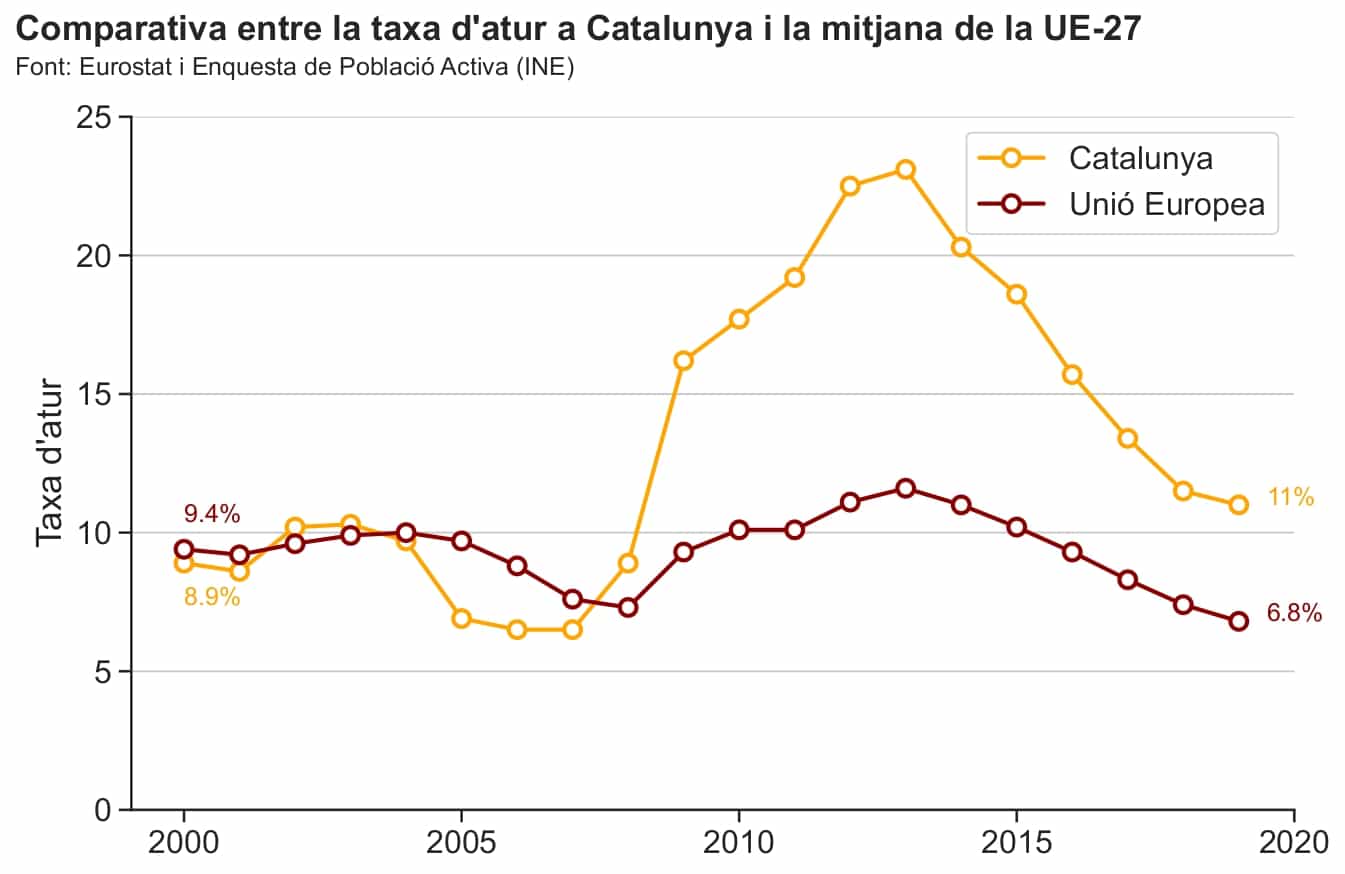 Evolució de la taxa d’atur a Catalunya en comparació amb la UE (des de 1986).
