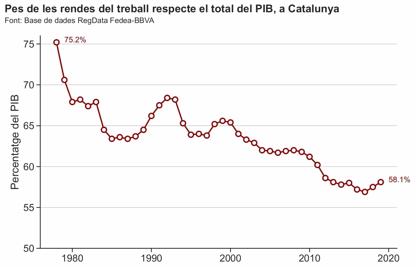 El pastís cada cop està pitjor repartit. És una evidència que es constata fent un ràpid com d’ull al descens accelerat del pes de les rendes del treball en relació al total del PIB del país. Si, a finals dels 70, tres de cada quatre euros (llavors, pessetes) de la riquesa de Catalunya anaven a la butxaca de les seves treballadores i treballadors, ara hi arriben menys del 60%. Les caigudes s’han accelerat i consolidat amb cada crisi econòmica, de la que han sortit sempre vencedores les elits empresarials, amb uns marges de beneficis que no paren de créixer a costa de la nostra precarietat.