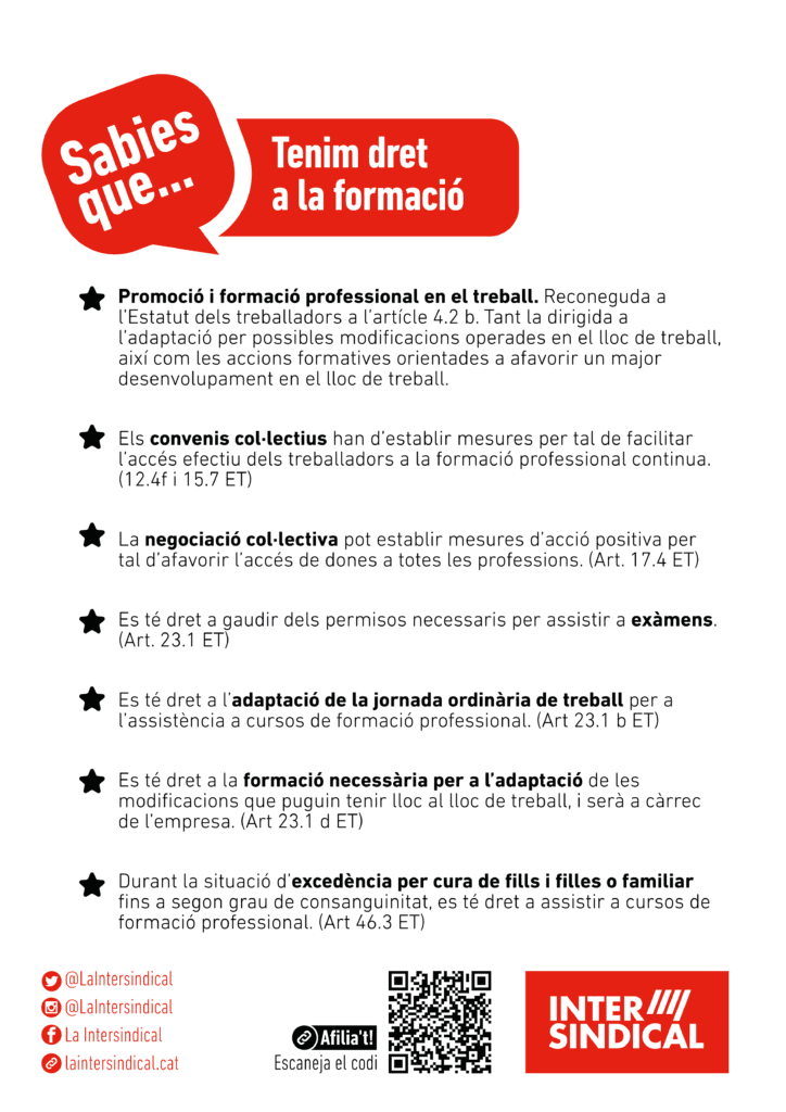 Promoció i formació professional en el treball. Reconeguda a l’Estatut dels treballadors a l’artícle 4.2 b. Tant la dirigida a l’adaptació per possibles modificacions operades en el lloc de treball, així com les accions formatives orientades a afavorir un major desenvolupament en el lloc de treball.