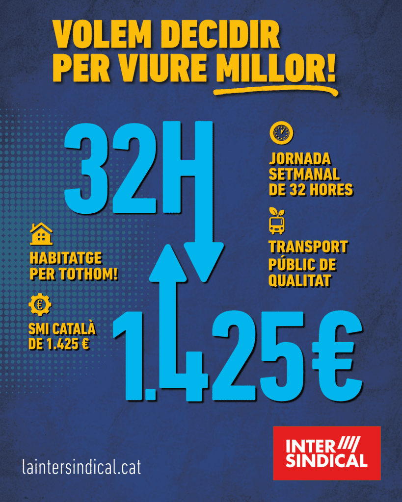 La Intersindical continua reclamant un Marc Propi de Relacions Socials i Laborals per tal de poder disposar d’un salari de 1425 EUR bruts en 14 pagues i  que ens permeti, alhora, decidir sobre les nostres condicions de vida, feina, habitatge i pensions.
