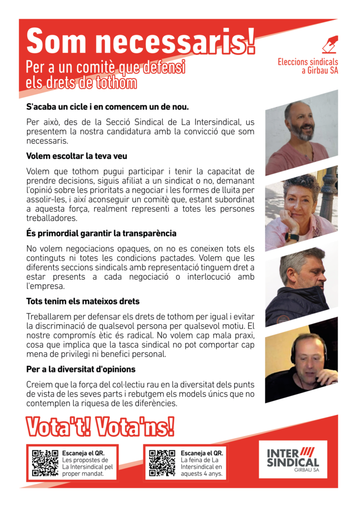 Ara és el moment de consolidar aquesta feina i continuar avançant cap a una Girbau on els drets laborals siguin una realitat i no només una promesa. Ens presentem a les eleccions sindicals amb l’objectiu de reforçar la nostra representació al comitè d’empresa i seguir impulsant canvis reals. En aquestes eleccions, ens hi juguem molt: el reconeixement dels nostres drets, la millora de les nostres condicions i la dignitat de la nostra feina. Junts, podem aconseguir-ho. El 6 de febrer, fem sentir la nostra veu. Vota La Intersindical.