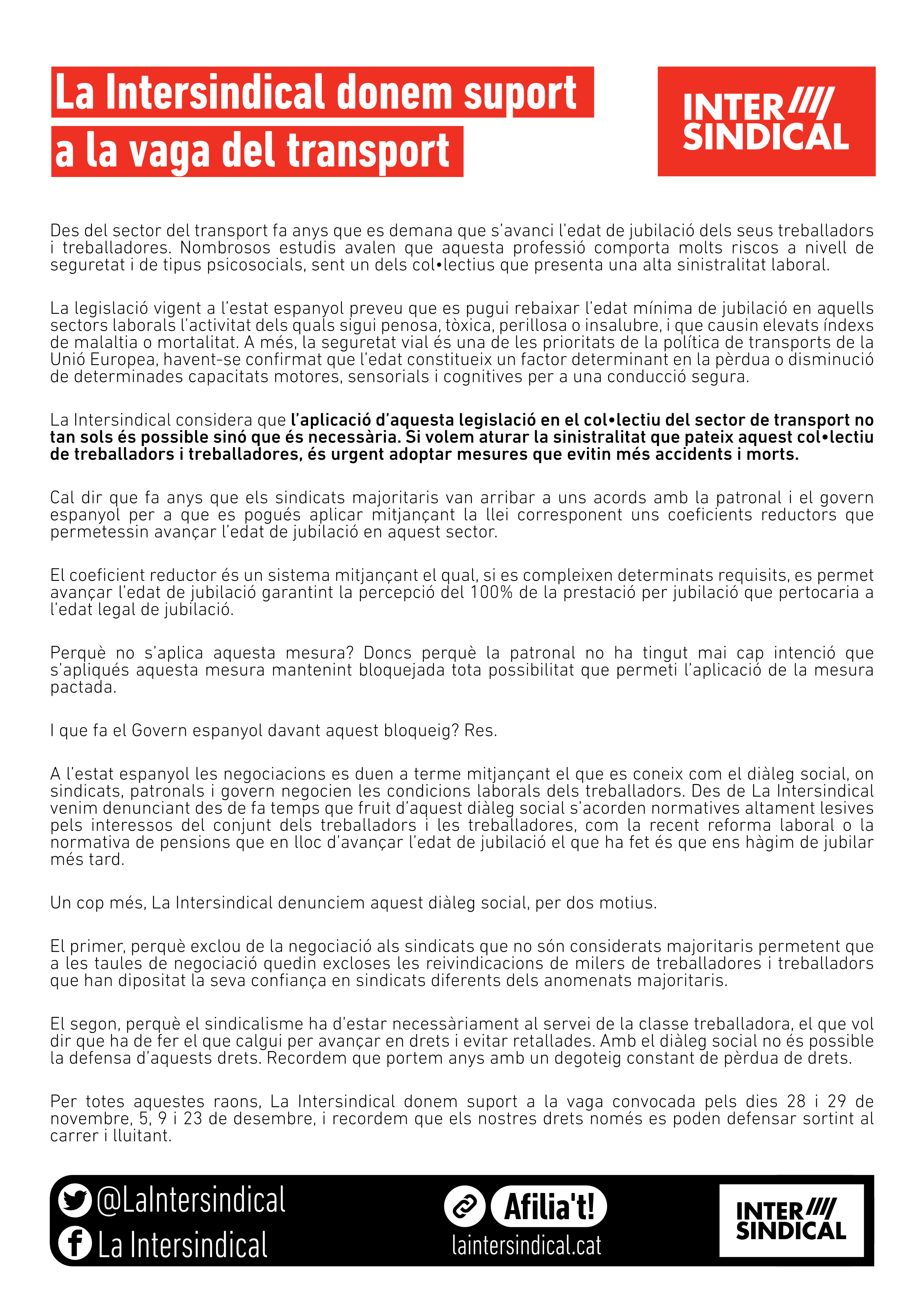 Per tots aquests motius, La Intersindical dona suport a la vaga convocada els dies 28 i 29 de novembre, 5, 9 i 23 de desembre. És moment de fer sentir la nostra veu. Només sortint al carrer i lluitant podrem defensar els nostres drets i aconseguir les millores que mereixem.