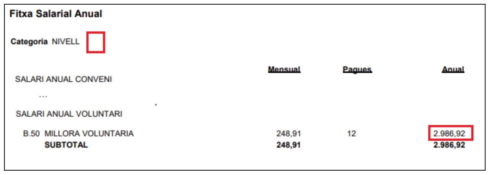 La part que us poden absorbir és el B.50 i B.67 anual de la Fitxa Salarial (FS) de desembre 2022. (+ complement BMN, si en teniu). Ho veureu a la FS de la manera següent: