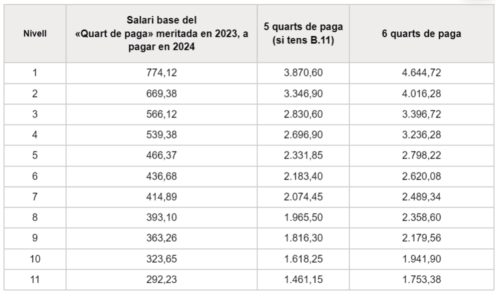 Qui tingui el complement B.11 li corresponen 5 quarts de paga i qui no en tingui, li corresponen les 6.